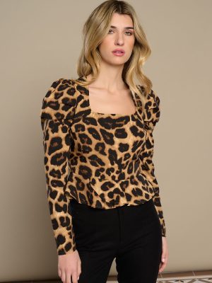 Valorado con 0 de 542,90€Blusa de escote cuadradado y manga larga abullonada. Detalle de peplum en cintura. Estampado animal print. -