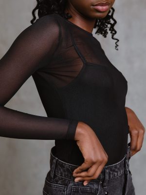 Valorado con 0 de 534,90€Camiseta de cuello redondo y manga larga. Semitransparente de tejido elástico. Forro interior elástico de tirantes. -