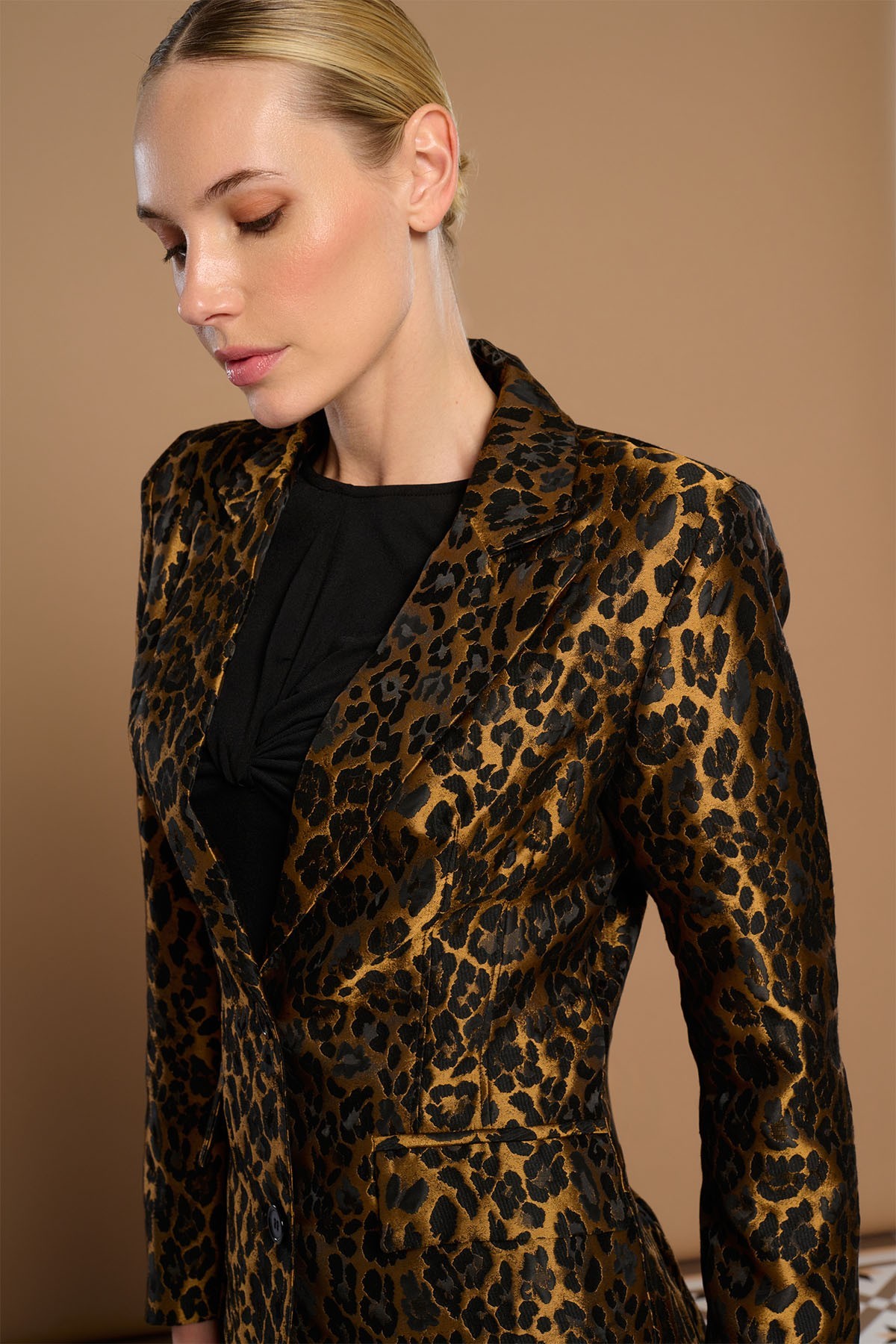 Blazer de cuello solapa y manga larga con hombreras. Bolsillos delanteros de vivo. Cierre frontal cruzado con botones. Forro interior. Estampado animal print satinado.