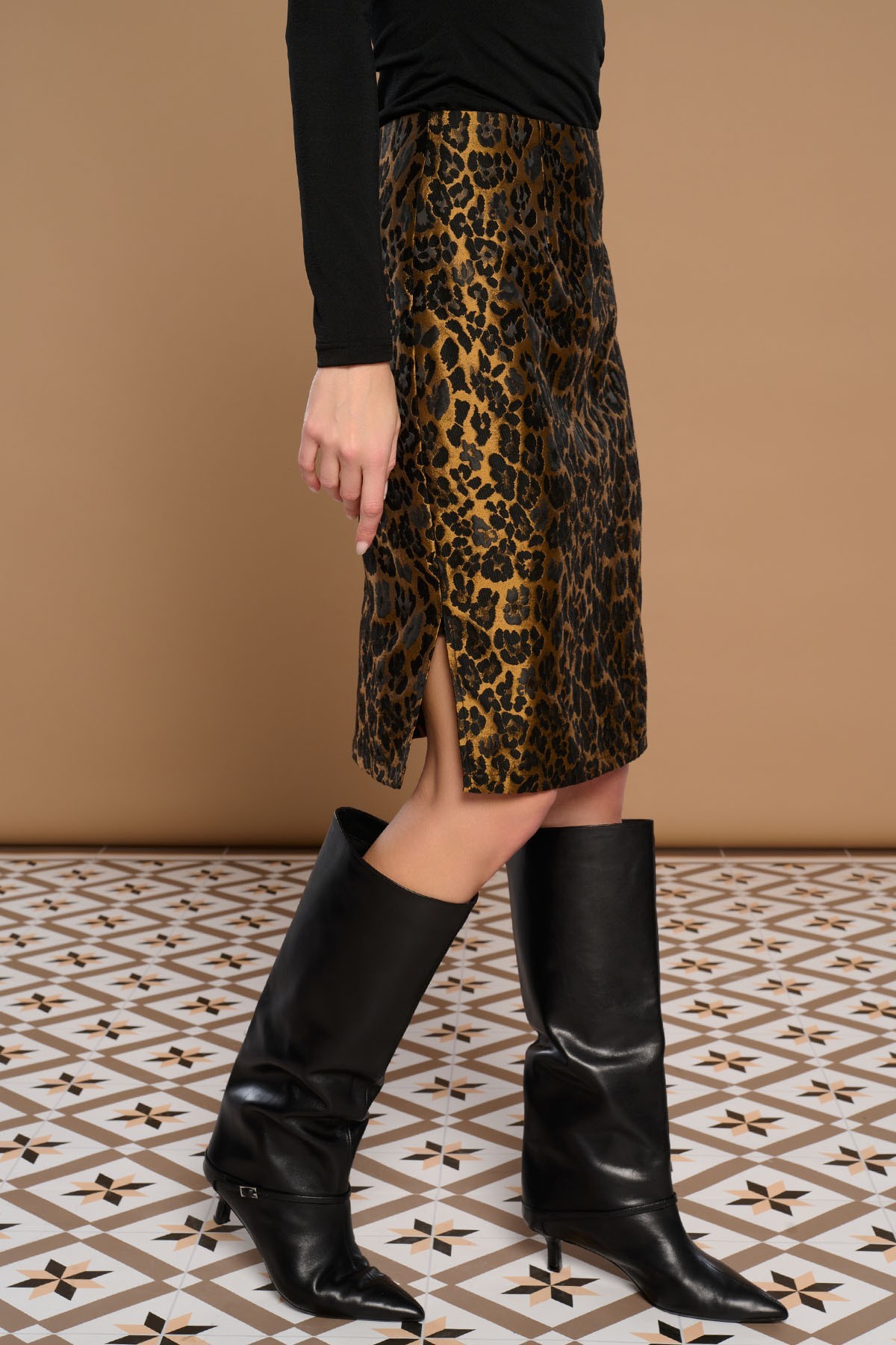 Falda midi de tiro medio. Estampado animal print. Forro interior. Cierre con cremallera oculta en costura.