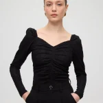 Camiseta de cuello redondo y manga larga. Semitransparente de tejido elástico. Forro interior elástico de tirantes.