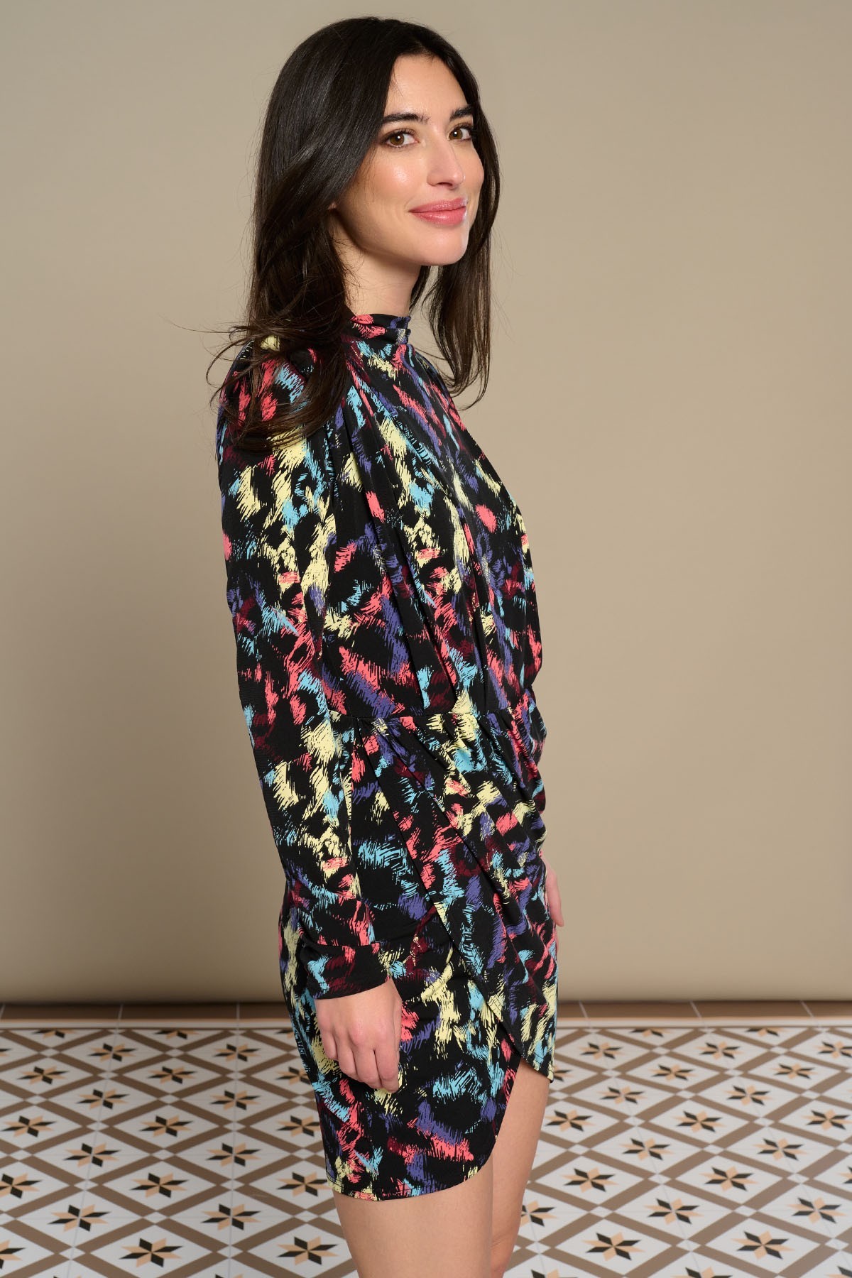 Vestido corto de cuello redondo y manga larga con hombreras. Estampado animal print. Falda efecto cruzado. Tejido elástico. Forro interior elástico.