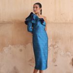 Vestido de cuello redondo, manga corta farol, corte en la cintura con un mini cut out, falda recta de largo midi y tres hileras de mini flecos simulando un volante, tejido jaquard de mini topos irregulares grabados en el tejido sobre su blanco roto. Da poca talla, recomendamos una mas de la habitual.