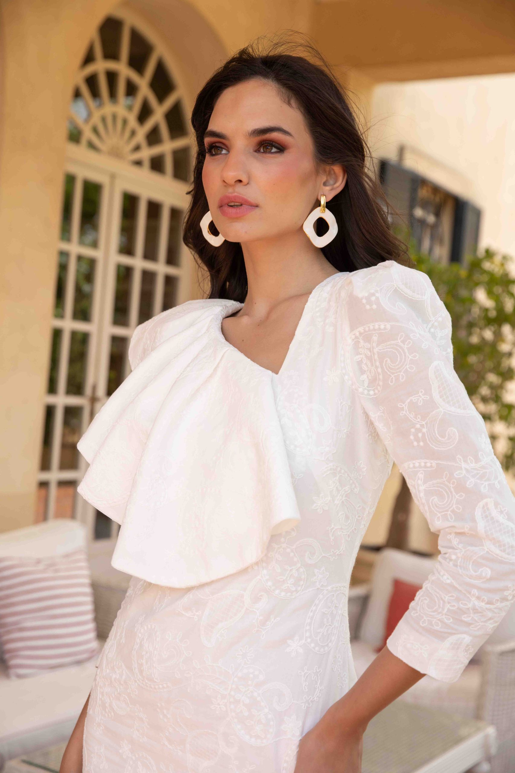 Vestido midi 100% algodón bordado. Volante zona pecho, abertura trasera y cierre con cremallera en espalda.